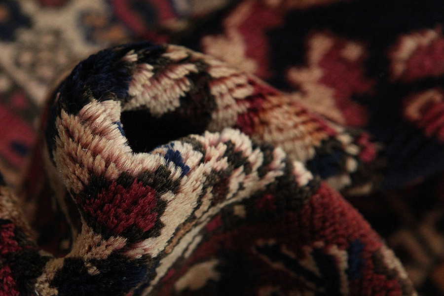 Abrash: Due to the different amount of grease in the wool and the added salt during the process of dyeing, the wool has got a varying colour absorbance. This is not very visible before weaving. During the weaving though, lines of the same colour are formed in the carpet. This is called Abrash (which in Farsi means little cloud) and it shows that the wool was not manufactured using chemical means and marks the naturalness and authenticity of the carpets. Examples