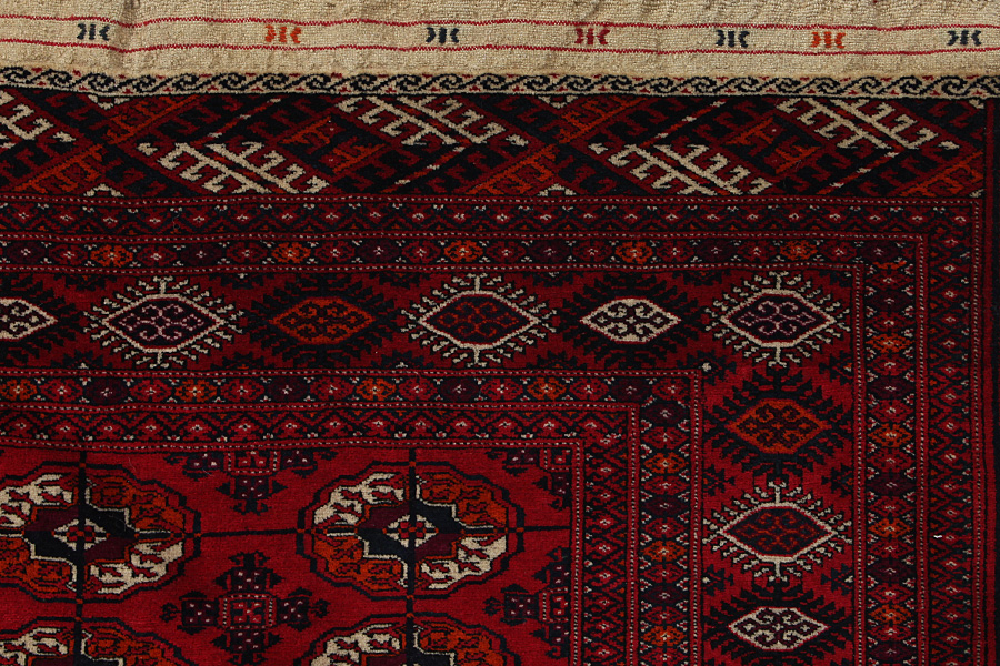 Tekke Carpets : The Tekke carpets bokhara that are woven in different regions of Uzbekistan, Turkmenistan and East Turkestan are examples of the carpet style called Bokhara. They belong to the group of Turkmen carpets. The deep red and the whole range of red from purple to brown are the dominant colors with repeating Bukhara designs. The warp of the carpets is wool.