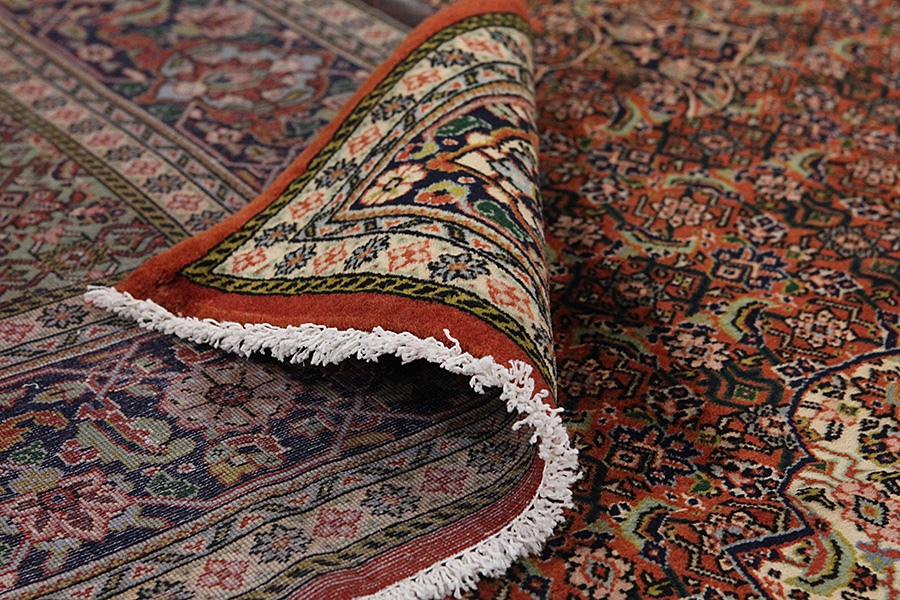 Abrash: Due to the different amount of grease in the wool and the added salt during the process of dyeing, the wool has got a varying colour absorbance. This is not very visible before weaving. During the weaving though, lines of the same colour are formed in the carpet. This is called Abrash (which in Farsi means little cloud) and it shows that the wool was not manufactured using chemical means and marks the naturalness and authenticity of the carpets. Examples