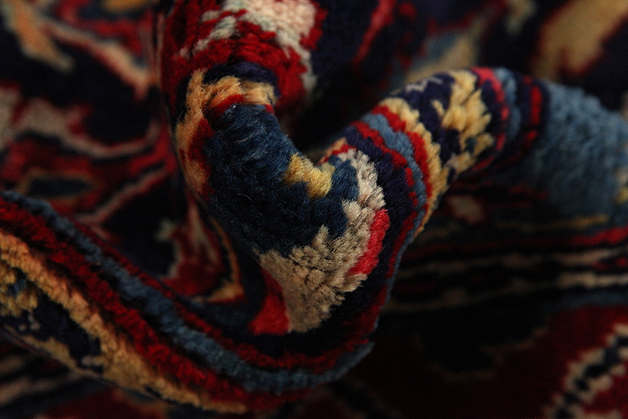 Abrash: Due to the different amount of grease in the wool and the added salt during the process of dyeing, the wool has got a varying colour absorbance. This is not very visible before weaving. During the weaving though, lines of the same colour are formed in the carpet. This is called Abrash (which in Farsi means little cloud) and it shows that the wool was not manufactured using chemical means and marks the naturalness and authenticity of the carpets. Examples
