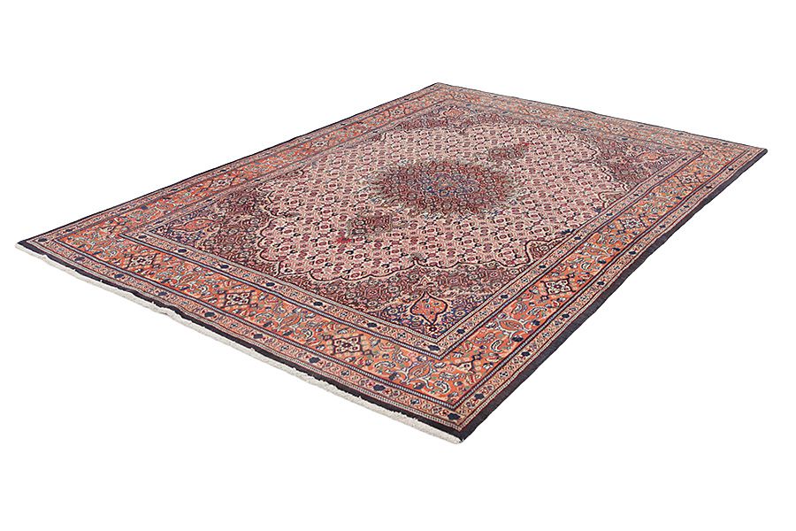 Mood Carpets : The city of Mood is located in the Khorasan province in Northeastern Iran. The manufacture of carpets and production of saffron made the city world-famous. Most Mood carpets are of high quality, made of thin, soft wool with fine and shapely designs. Mood carpets are woven with an asymmetrical knot. Bright blue and red with beige for contrast are usually used. In their designs flowers and medallions are typically used. The artisans often weave the Mir design and the design called the garden (i.e., repeated squares decorated with trees, weeping willows, flowers, deer and birds).