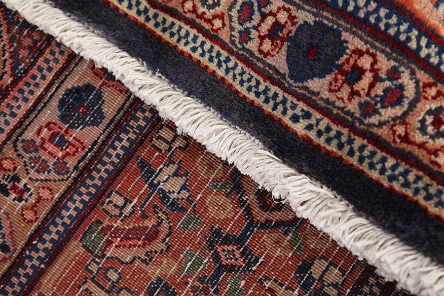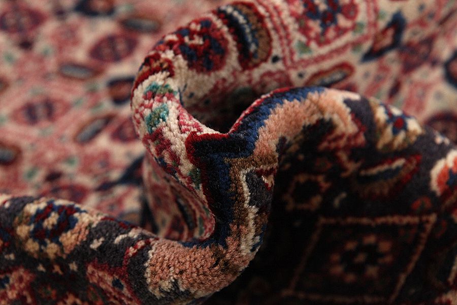 Abrash: Due to the different amount of grease in the wool and the added salt during the process of dyeing, the wool has got a varying colour absorbance. This is not very visible before weaving. During the weaving though, lines of the same colour are formed in the carpet. This is called Abrash (which in Farsi means little cloud) and it shows that the wool was not manufactured using chemical means and marks the naturalness and authenticity of the carpets. Examples
