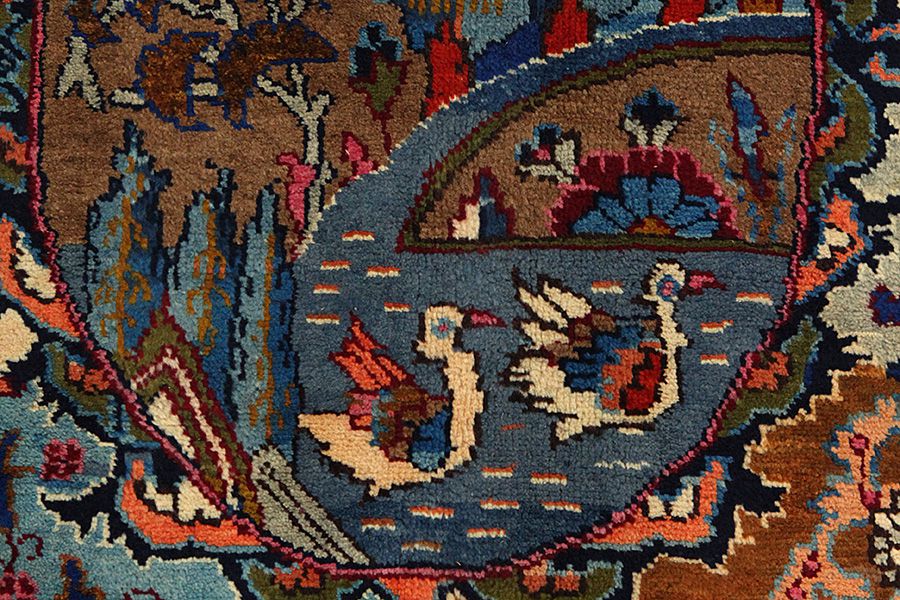 Kashmar Carpets : The city of Kashmar is located in the Khorasan province southwest of the city Mashad in Eastern Iran. It has a very rich history and its old name is Torshiz. Exquisite high quality carpets have been woven for centuries there. The carpets are woven thick, with fine soft wool in beautiful blue colors in contrast with cream and ivory beige. In newer carpets they use soft green, red and brown. Characteristic of Kashmar carpets are the large sizes and the unique designs that look like paintings with trees, flowers and domes of mosques. Also depicted are representations that recount historical events, major incidents from Persian history or a historically known person or the story of a revered Persian king. In Kashmar they weave elegant masterpieces of color harmony, complexity of designs in detail, to show the Persian love of beauty and art. Kashmar rugs and carpets are durable and grow more beautiful with time.