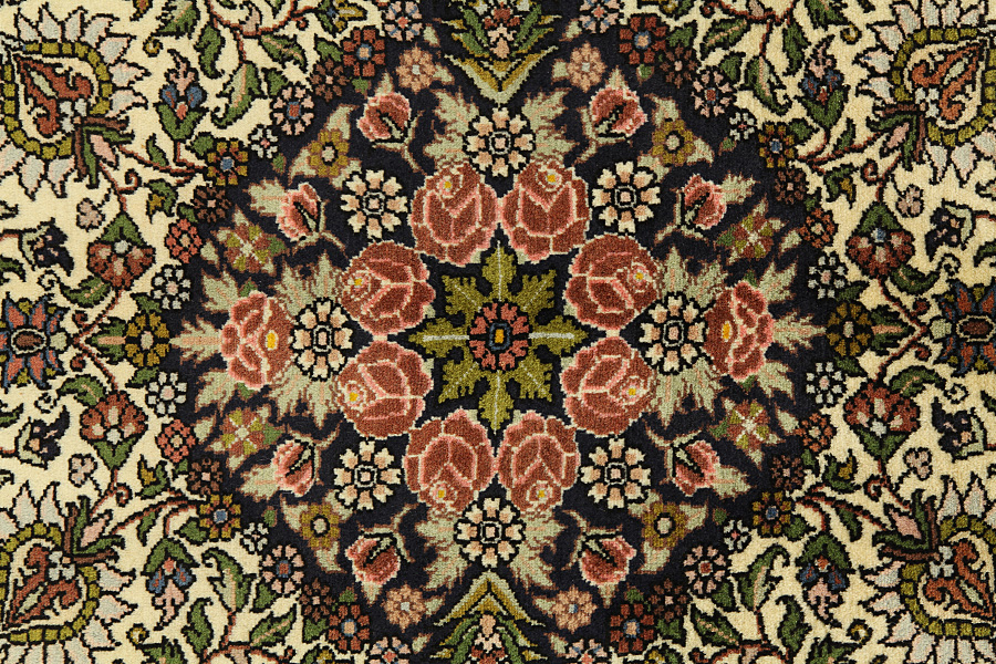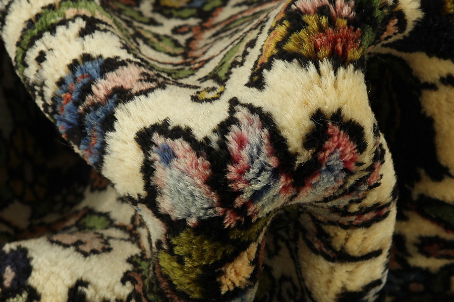 Abrash: Due to the different amount of grease in the wool and the added salt during the process of dyeing, the wool has got a varying colour absorbance. This is not very visible before weaving. During the weaving though, lines of the same colour are formed in the carpet. This is called Abrash (which in Farsi means little cloud) and it shows that the wool was not manufactured using chemical means and marks the naturalness and authenticity of the carpets. Examples