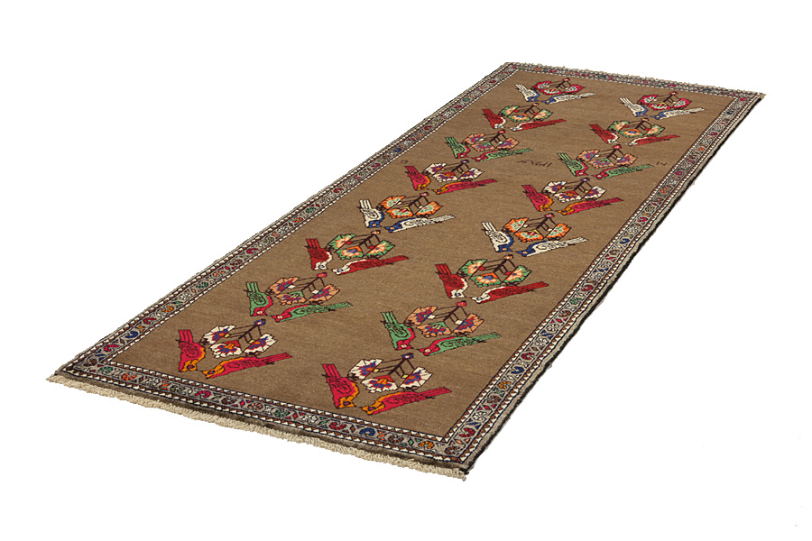 Qashqai Carpets : Qashqai carpets are woven by nomads who live in the mountainous areas of Southwest Persia, the provinces of Fars, Khuzestan, south of Isfahan and around the city Shiraz. Their carpets have a high knot density and a wide variety of designs, usually in deep red and blue colors. They weave carpets, Kilims and decorative textiles (ribbons, bags, etc.), which depict scenes from their lives with various representation of humans, animals, birds, trees and flowers. They also depict historical monuments, mostly from Persepolis.