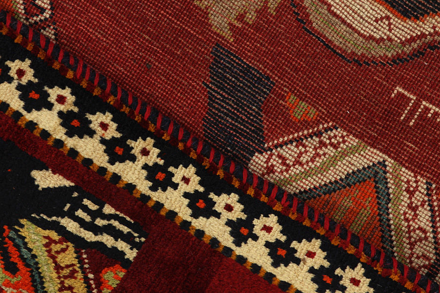 Qashqai Carpets : Qashqai carpets are woven by nomads who live in the mountainous areas of Southwest Persia, the provinces of Fars, Khuzestan, south of Isfahan and around the city Shiraz. Their carpets have a high knot density and a wide variety of designs, usually in deep red and blue colors. They weave carpets, Kilims and decorative textiles (ribbons, bags, etc.), which depict scenes from their lives with various representation of humans, animals, birds, trees and flowers. They also depict historical monuments, mostly from Persepolis.