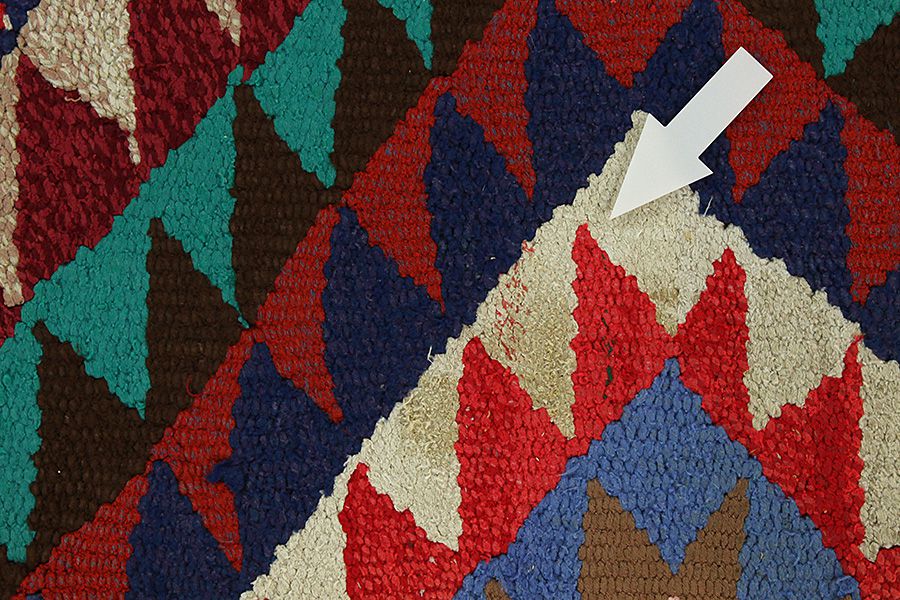 Abrash: Due to the different amount of grease in the wool and the added salt during the process of dyeing, the wool has got a varying colour absorbance. This is not very visible before weaving. During the weaving though, lines of the same colour are formed in the carpet. This is called Abrash (which in Farsi means little cloud) and it shows that the wool was not manufactured using chemical means and marks the naturalness and authenticity of the carpets. Examples