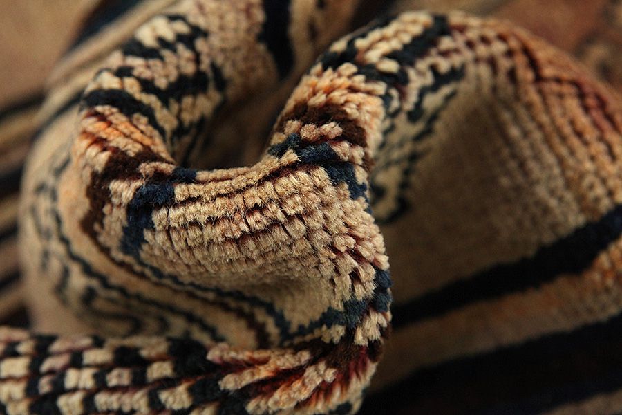 Abrash: Due to the different amount of grease in the wool and the added salt during the process of dyeing, the wool has got a varying colour absorbance. This is not very visible before weaving. During the weaving though, lines of the same colour are formed in the carpet. This is called Abrash (which in Farsi means little cloud) and it shows that the wool was not manufactured using chemical means and marks the naturalness and authenticity of the carpets. Examples