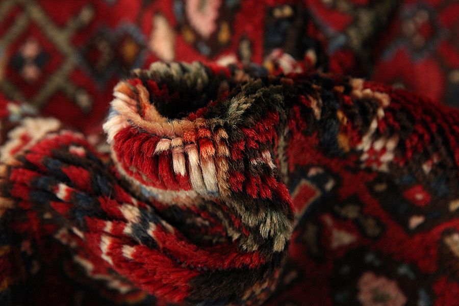 Abrash: Due to the different amount of grease in the wool and the added salt during the process of dyeing, the wool has got a varying colour absorbance. This is not very visible before weaving. During the weaving though, lines of the same colour are formed in the carpet. This is called Abrash (which in Farsi means little cloud) and it shows that the wool was not manufactured using chemical means and marks the naturalness and authenticity of the carpets. Examples