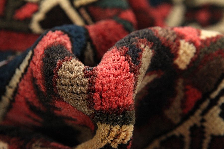Abrash: Due to the different amount of grease in the wool and the added salt during the process of dyeing, the wool has got a varying colour absorbance. This is not very visible before weaving. During the weaving though, lines of the same colour are formed in the carpet. This is called Abrash (which in Farsi means little cloud) and it shows that the wool was not manufactured using chemical means and marks the naturalness and authenticity of the carpets. Examples