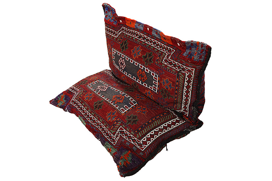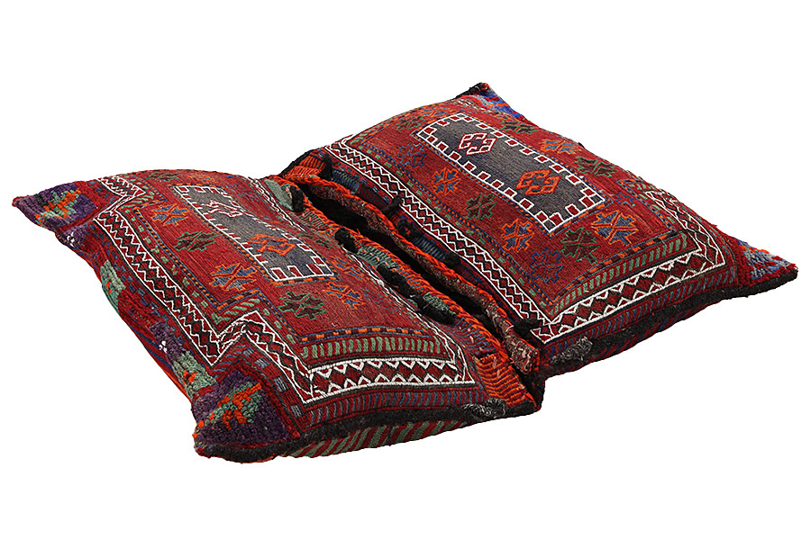 Saddle Bag Carpets : ​Horse saddle bags are made by Nomads for their own use. One can distinguish between the kilim-horse saddle bags and the knotted horse saddle bags. The front side of a knotted horse saddle bag is either knotted like a common carpet with knots or different mixed techniques are used. The side parts are often woven whereas in the middle part different weaving techniques such as kelim or Soumak are applied. The colors horse bags are dyed with are all natural and made by the Nomads themselves. Bags like these once carried everyday necessities for travelers on donkeys or horses. A delightful piece of art that provides a unique oriental atmosphere to your home. Horse saddle bags can be used as a seat cushion, as a floor cushion eg in front of your fireplace or as a wall decoration. Smaller horse saddle bags can be used as a newspaper holder to store newspapers or magazines when slung over a chair or sofa.