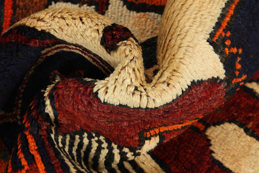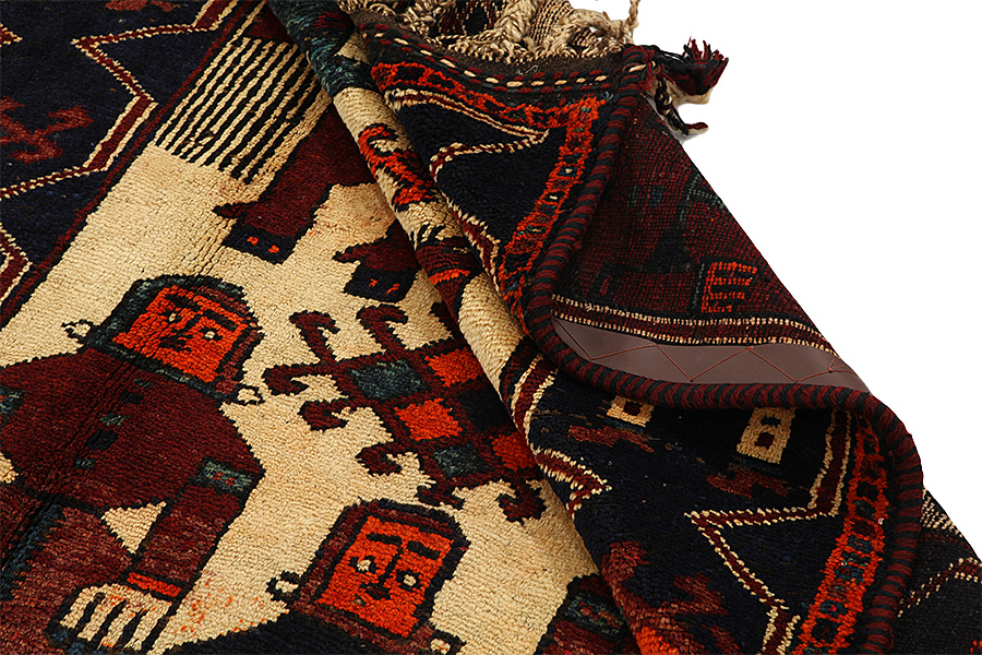 Qashqai Carpets : Qashqai carpets are woven by nomads who live in the mountainous areas of Southwest Persia, the provinces of Fars, Khuzestan, south of Isfahan and around the city Shiraz. Their carpets have a high knot density and a wide variety of designs, usually in deep red and blue colors. They weave carpets, Kilims and decorative textiles (ribbons, bags, etc.), which depict scenes from their lives with various representation of humans, animals, birds, trees and flowers. They also depict historical monuments, mostly from Persepolis.