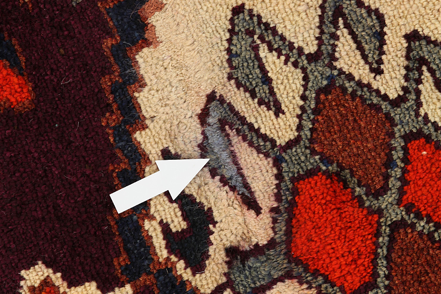 Abrash: Due to the different amount of grease in the wool and the added salt during the process of dyeing, the wool has got a varying colour absorbance. This is not very visible before weaving. During the weaving though, lines of the same colour are formed in the carpet. This is called Abrash (which in Farsi means little cloud) and it shows that the wool was not manufactured using chemical means and marks the naturalness and authenticity of the carpets. Examples